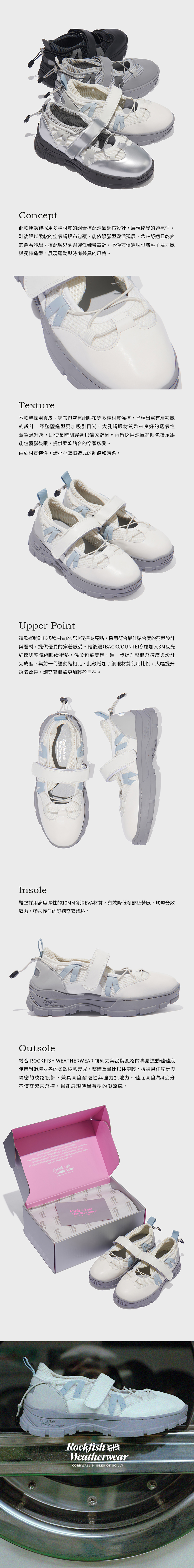 材質 - 鞋面 (BK, WH): 牛皮 100%, 聚酯纖維 100% / 鞋面 (SV, DS): PU 100%, 聚酯纖維 100% / 鞋墊: EVA 100% / 外底: INJECTION PHYLON 100% 聚酯纖維/聚酯纖維